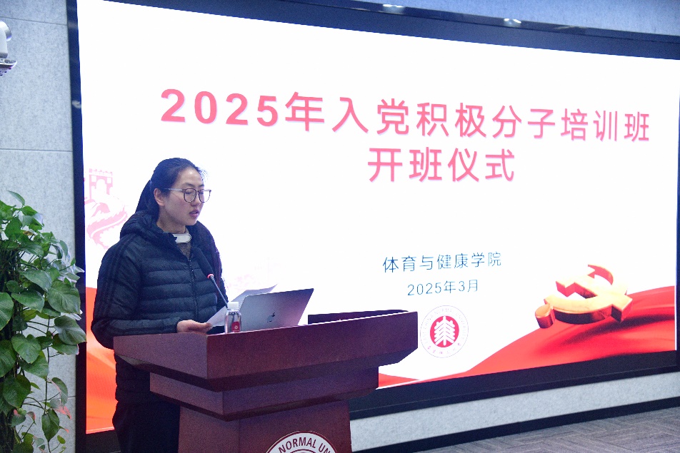 为深刻领会习近平新时代中国特色社会主义思想,进一步加强入党积极分子系统性理论学习与实践锤炼,2025年3月5日下午,在亚洲色吧 党委指导下,2025年学院入党积极分子培训班开班仪式暨第一次集中培训,在二楼报告厅顺利举行。出席开班仪式的有学院党委副书记兼副院长李浩、体育教育教工党支部书记杜舒书、专职组织员袁春、本科生党支部书记宋戈、部分学生党支部书记代表及经过严格遴选的68名入党积极分子。会议由学员代表谭钧译主持。