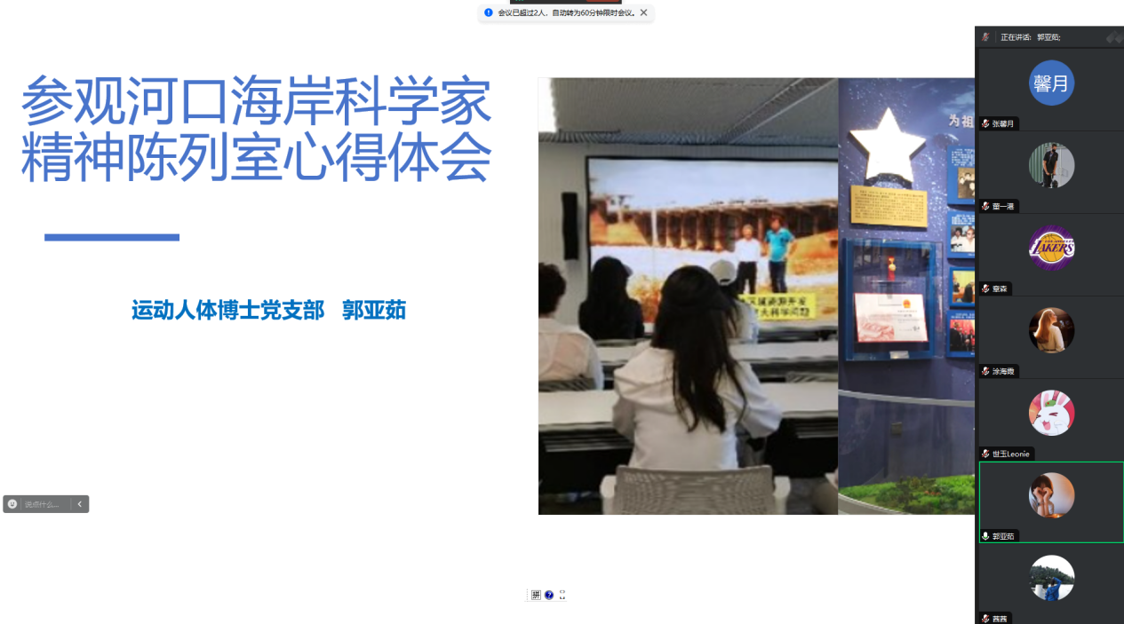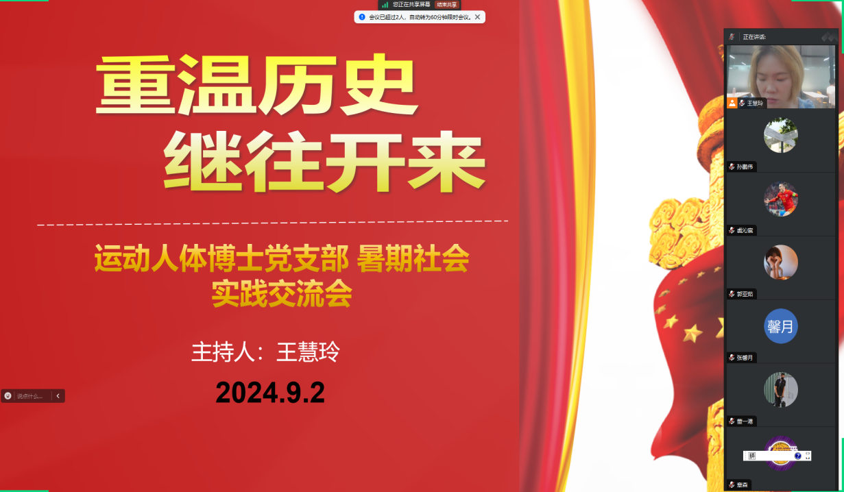 为积极响应教育部有关于深化高校学生暑期社会实践的相关要求与学校党委组织部指导意见,全面落实学院制定的《亚洲色吧 师生党员基本培训实践教学工作方案》,进一步了解党的艰辛历程、光荣传统、宝贵经验和伟大成就,继承弘扬伟大建党精神,运动人体博士党支部于2024年9月2日以“重温历史,继往开来”为主题召开线上暑期社会实践交流会,支部党员对个人或小组的暑期实践经历进行总结并作交流分享,支部全体成员参加,会议由王慧玲同志主持。
