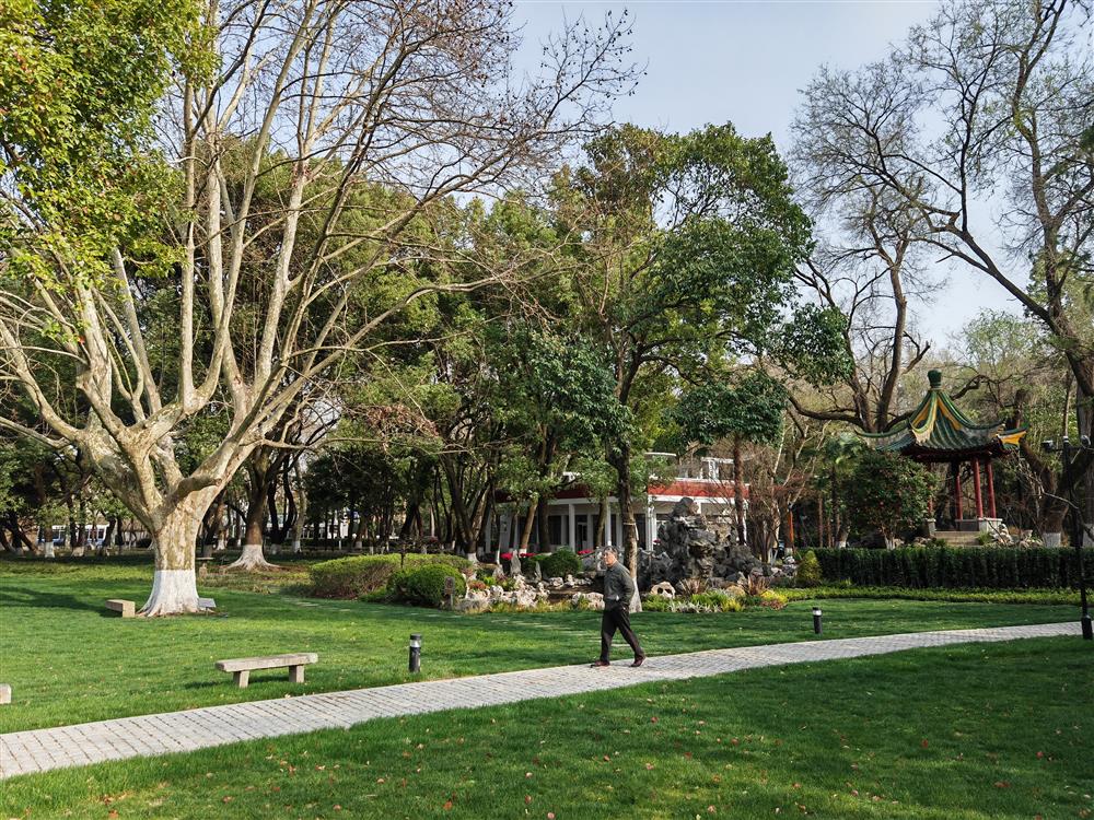 春天里,亭台之外,华政园大草坪打开围墙,与对面的中山公园一样透绿。徐瑞哲 摄