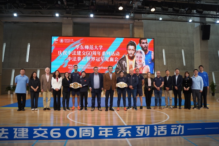 3月24日下午,法式拳击冠军代表团到访华东师大,中法拳击世界冠军见面会在闵行校区篮球馆举行。