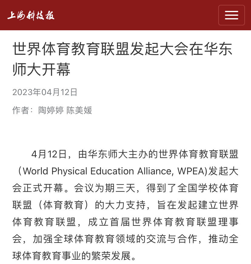 4月12日,由华东师大主办的世界体育教育联盟(World Physical Education Alliance, WPEA)发起大会正式开幕。会议为期三天,得到了全国学校体育联盟(体育教育)的大力支持,旨在发起建立世界体育教育联盟,成立首届世界体育教育联盟理事会,加强全球体育教育领域的交流与合作,推动全球体育教育事业的繁荣发展。